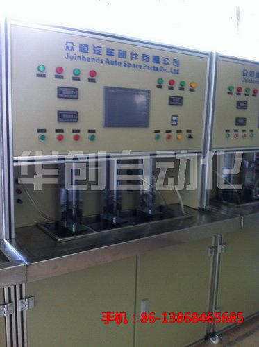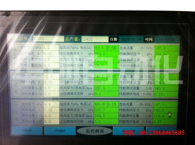 1,控制系統 采用華創公司自行研發的檢測臺專用控制HC3U系列PLC,觸摸屏。 2,采樣元件: 流量,壓力,電流電壓。 執行元件:電磁閥(SMC) 3,伺服精密調壓閥門由本公司自行開發的不銹鋼304精細閥門 |